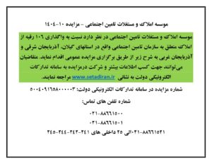 بر اساس اعلام کمیسیون معاملات مؤسسه، متقاضیان می توانند جهت کسب اطلاعات تکمیلی و شرکت در مزایده به سامانه تدارکات الکترونیک دولت به نشانی WWW.setadiran.ir یا