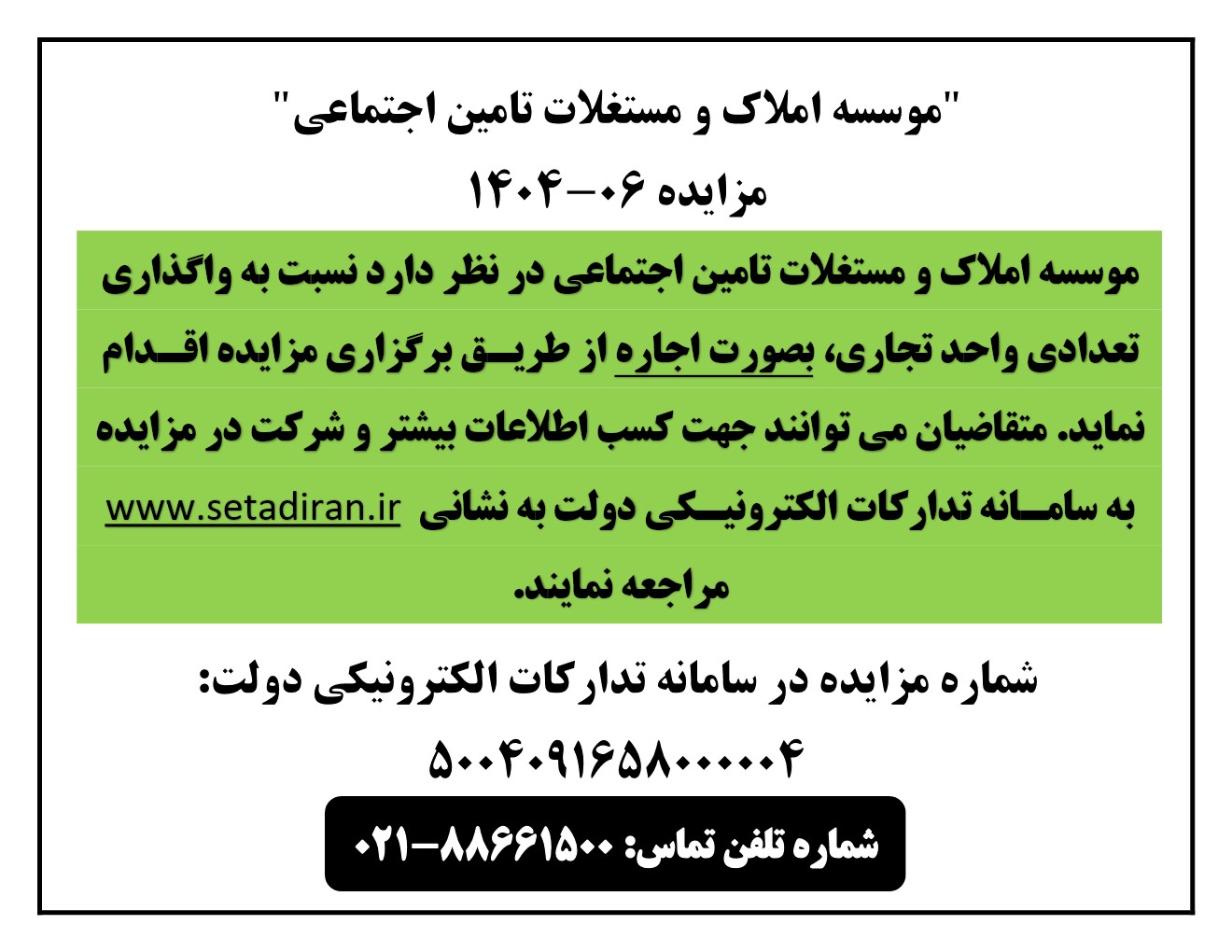 گفتنی است، نتیجه نهایی مزایده با رعایت کامل آییننامه مالی و معاملاتی املاک و مستغلات سازمان تأمین اجتماعی در جلسه مذکور و در تاریخ ۲۶ آذرماه از طریق سامانه تدارکات الکترونیک اعلام خواهد شد.