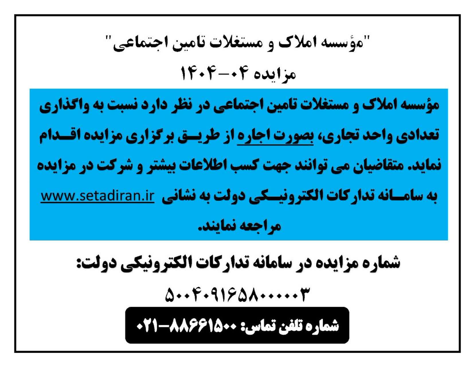 مؤسسه املاک و مستغلات تامین اجتماعی در نظر دارد نسبت به واگذاری تعدادی واحد تجاری، بصورت اجاره از طریق برگزاری مزایده اقدام نماید.