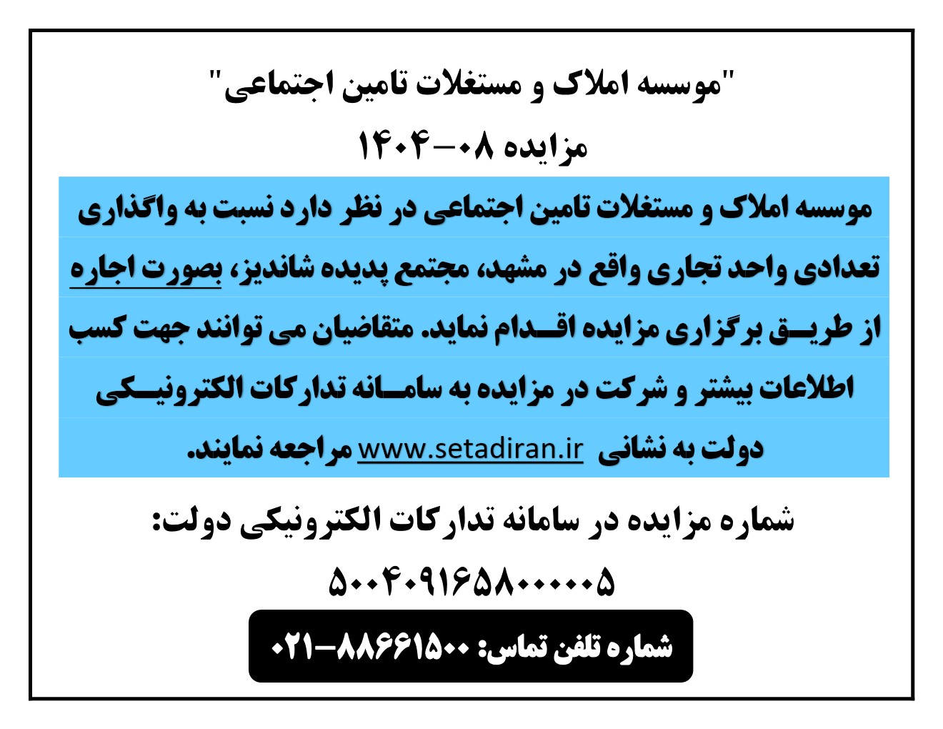 بر اساس اعلام کمیسیون معاملات مؤسسه، متقاضیان می توانند جهت کسب اطلاعات تکمیلی و شرکت در مزایده به سامانه تدارکات الکترونیک دولت به نشانی WWW.setadiran.ir یا با شماره تلفن ۸۸۶۶۱۵۰۰ _۰۲۱تماس حاصل نمایند.